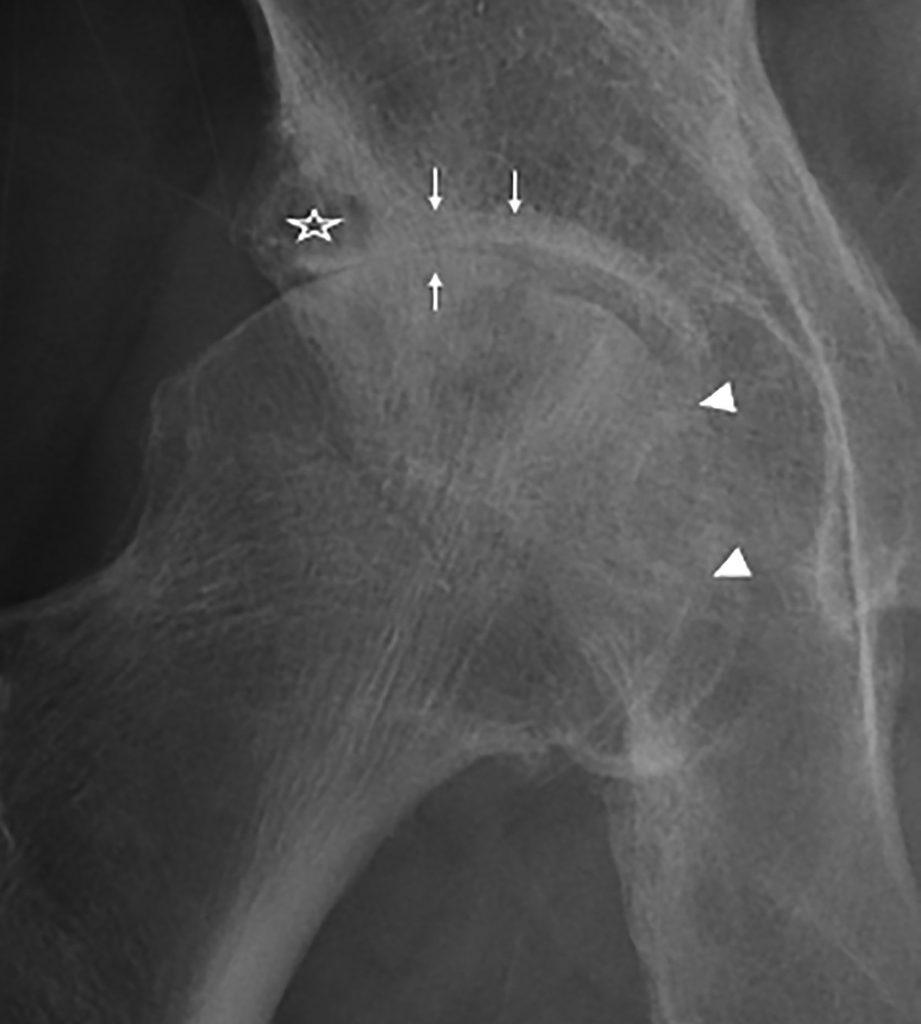 Radiographie de face de la hanche droite montrant le pincement articulaire supérieur (flèches) avec des ostéophytes périfovéal (tête de flèche), des géodes sous-chondrales (étoile) et une osteosclérose sous-chondrale de la tête fémorale et de l’acétabulum (flèche).