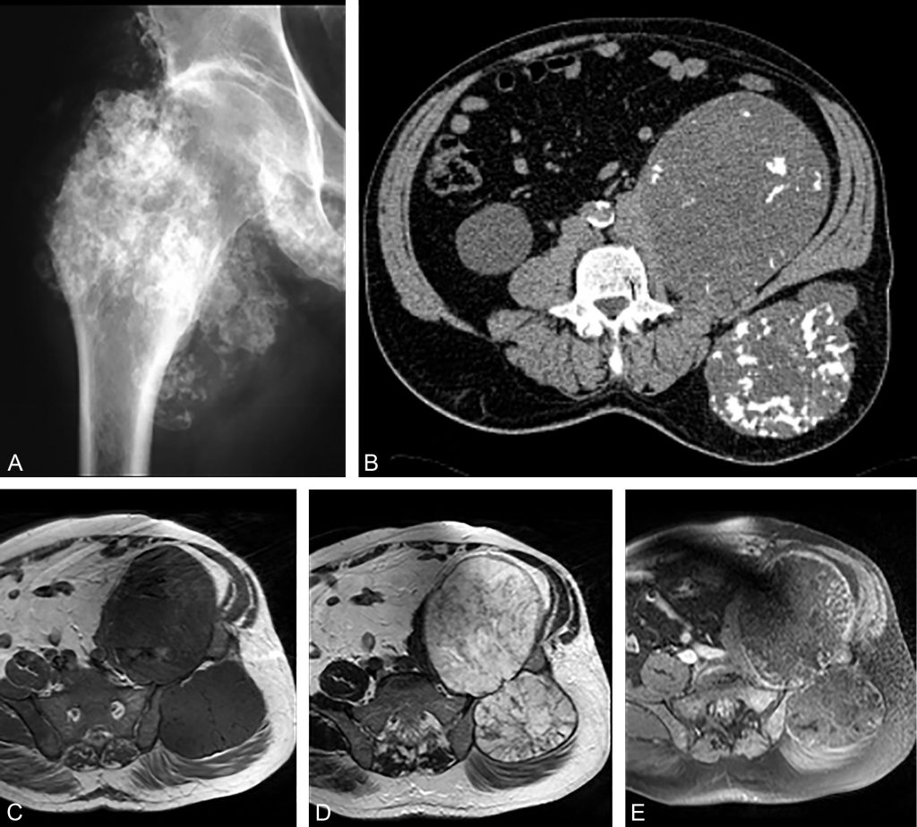 La matrice cartilagineuse est évoquée devant des calcifications arciformes visibles sur la radiographie (A) et le scanner (B) ainsi que sur l’IRM en hyposignal T1 (C), hypersignal T2 (D) avec un rehaussement en arc et anneaux sur la séquence T1 Fat Sat après injection de produit de contraste (E). Notez l’extension de la lésion aux parties molles endo- et exopelviennes.