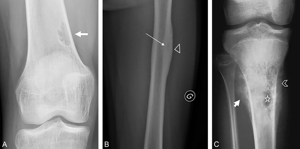 (A) Fibrome non ossifiant « don’t-touch-lesion » : radiographie du fémur de face, lésion ostéolytique avec sclérose périphérique de topographie métaphysaire excentrée d’aspect multilobulée dont le grand axe est parallèle à celui de la diaphyse fémorale. Il n’y a pas d’envahissement des parties molles ni d’apposition périostée. (B) Ostéome ostéoïde : radiographie du fémur de face, épaississement cortical fusiforme (tête de flèche), développé dans l’axe du fémur centré par une lacune intracorticale ovalaire appelé nidus (flèche). (C) Ostéosarcome : radiographie du genou de face, ostéolyse agressive perméative excentrée (étoile) de la métaphyse supérieure du tibia avec envahissement des parties molles (tête de flèche) et réaction périostée agressive en « feu d’herbe » (flèche).