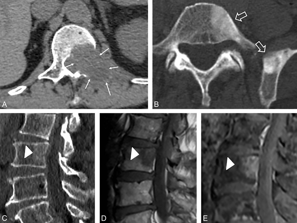 (A) Métastases ostéolytique du corps vertébral de T12 avec envahissement des parties molles et de l’espace épidural chez un patient ayant un cancer du poumon. (B) Métastases ostéocondensantes du corps vertébral de L5 et de la partie postérieure de l’aile iliaque gauche chez un patient ayant un cancer de la prostate. (C à E) Métastase de cancer du sein dans un plan sagittal très discrètement condensante de la partie postérieure du corps vertébral de L4 (C) parfaitement visualisée en IRM en hyposignal T1 (D) et rehaussée sur la séquence T1 Fat Sat après injection de produit de contraste (E).