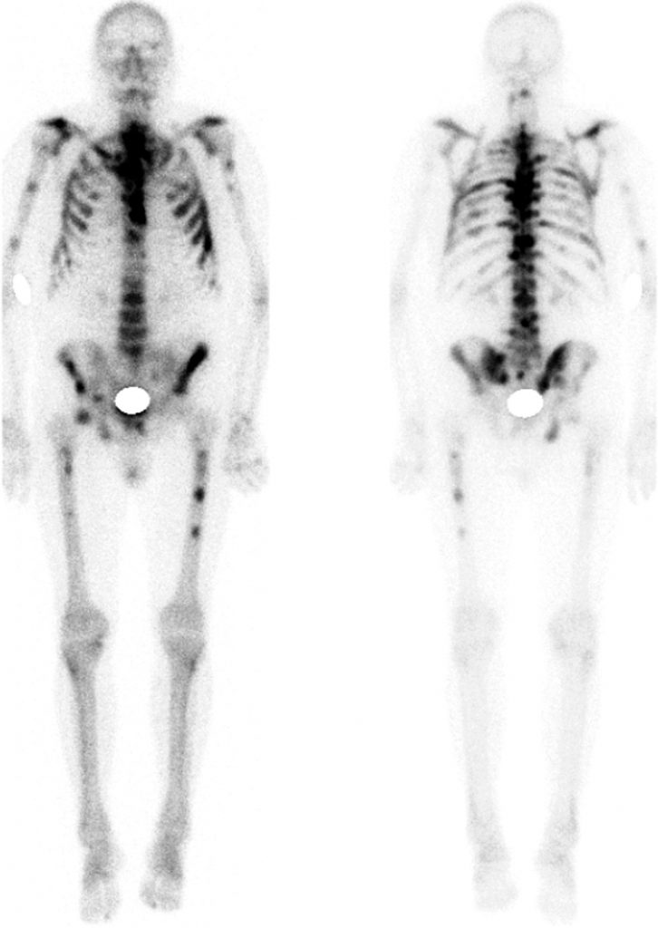Fig. 88.2 Métastases osseuses d’un cancer prostatique en scintigraphie. Multiples foyers d’hyperfixation sur le squelette axial et périphérique.