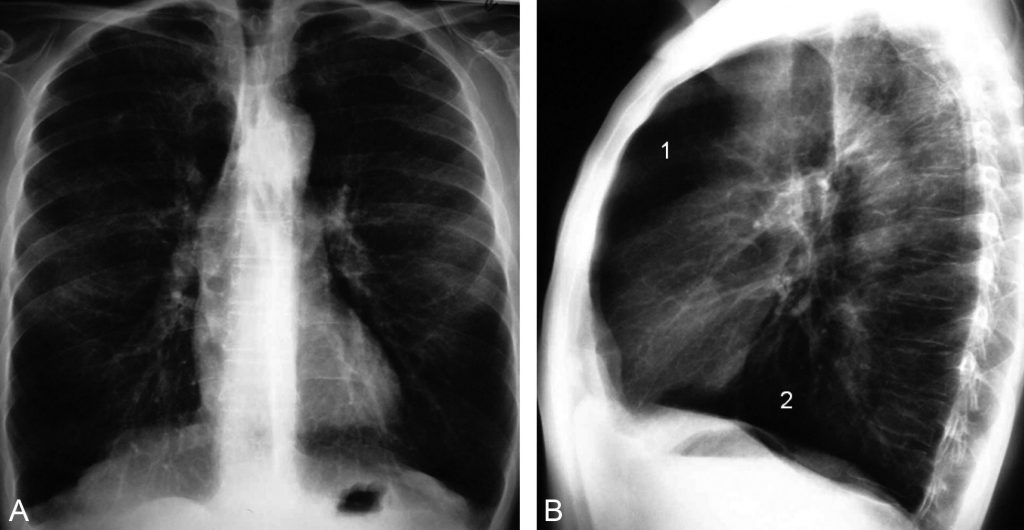 Le cliché de face (A) montre huit arcs antérieurs de côtes au-dessus du diaphragme et une hyperclarté diffuse du parenchyme pulmonaire. Le cliché de profil (B) montre une augmentation du diamètre antéropostérieur du thorax, un aplatissement des coupoles diaphragmatiques, et un élargissement des espaces clairs rétrosternal (1) et rétrocardiaque (2).