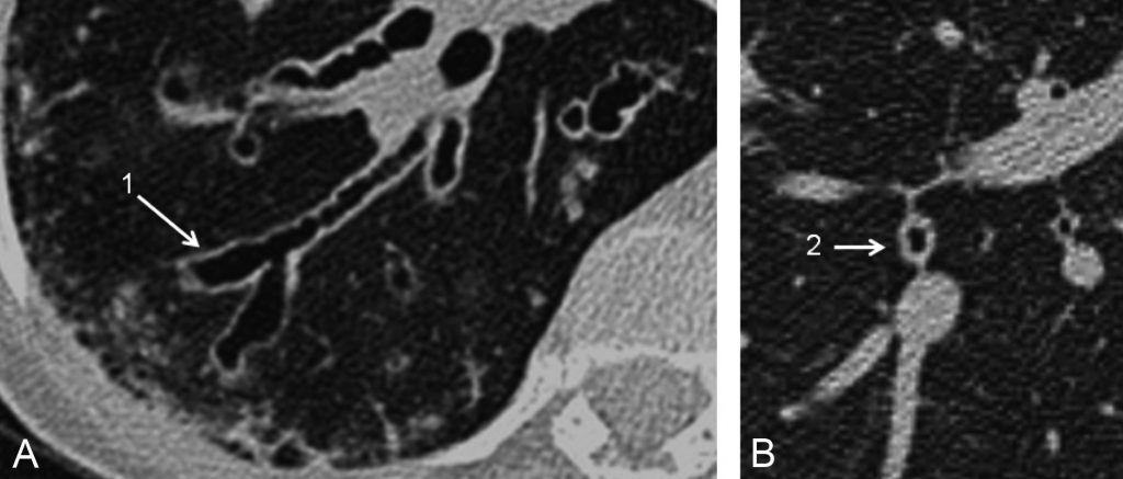 Coupe centrée sur une bronche de la pyramide basale droite (A) montrant des bronchectasies variqueuses (1) et (B) un important épaississement pariétal (2).