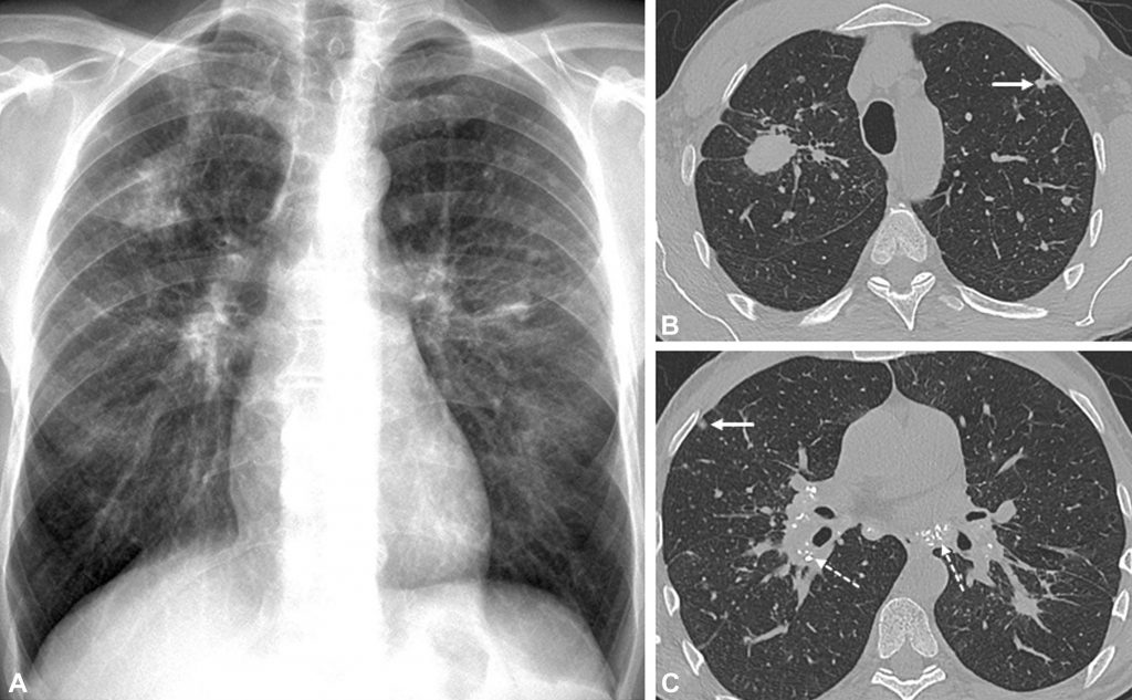 Radiographie de face (A) et coupes TDM (B, C) montrant des opacités macro- et micronodulaires bilatérales prédominant dans les sommets, certaines de topographie sous-pleurale (flèches pleines), accompagnées d’adénopathies calcifiées médiastinales et hilaires (flèches en pointillé).
