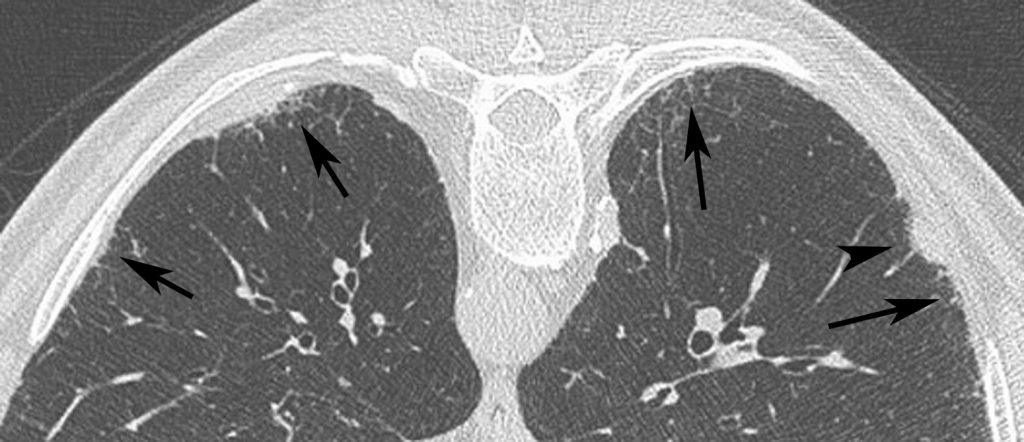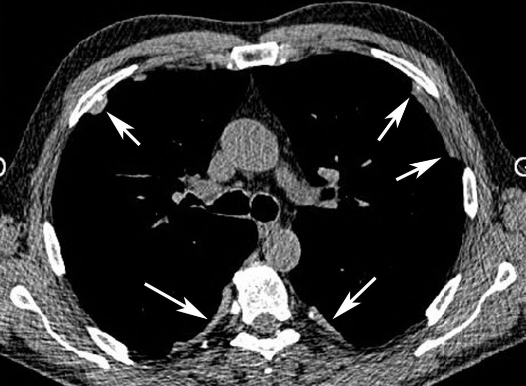 Image de scanner sans injection en décubitus ventral, en coupe axiale, évocatrice avec des réticulations et des micronodules centrolobulaires (flèches) associés à une plaque pleurale (tête de flèche) et situés dans les culs-de-sac postérieurs et le cortex du poumon.