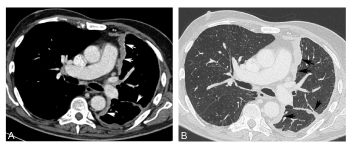 Tomodensitométrie en fenêtre médiastinale (A) et pulmonaire (B) après injection de produit de contraste. Il existe un épaississement irrégulier et nodulaire de la plèvre de l’hémithorax gauche prédominant sur la plèvre médiastinale (flèches). L’épaississement se prolonge vers la grande scissure gauche (flèches). Notez la rétraction de l’hémithorax gauche.