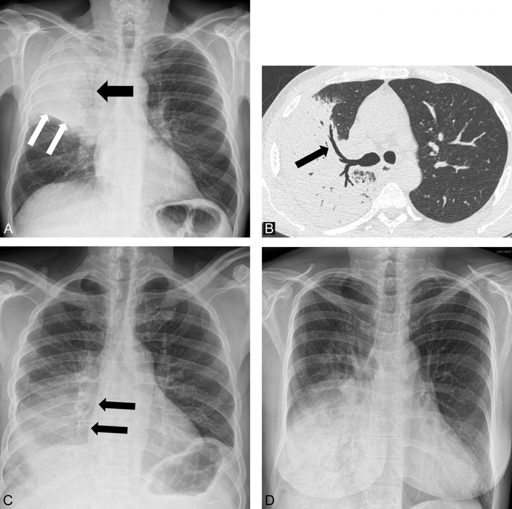 (A) Radiographie de thorax de face. Foyer de condensation alvéolaire avec bronchogramme aérique (flèche noire), systématisé au lobe supérieur droit avec appui scissural (flèches blanches). (B) Scanner thoracique chez le même patient qu’en A. Condensation du lobe supérieur droit avec bronchogramme aérique (flèche). (C) Radiographie de thorax de face (autre patient). Foyer de condensation alvéolaire de champ pulmonaire inférieur droit, n’effaçant pas le bord droit de la silhouette cardiaque (flèches noires) . Le signe de la silhouette est négatif, la pneumonie n’est pas antérieure et intéresse donc le lobe inférieur droit. (D) Radiographie de thorax de face (autre patient). Foyer de condensation alvéolaire de champ pulmonaire inférieur droit, effaçant le bord droit de la silhouette cardiaque . Le signe de la silhouette est positif, la pneumonie est antérieure et intéresse donc le lobe moyen.
