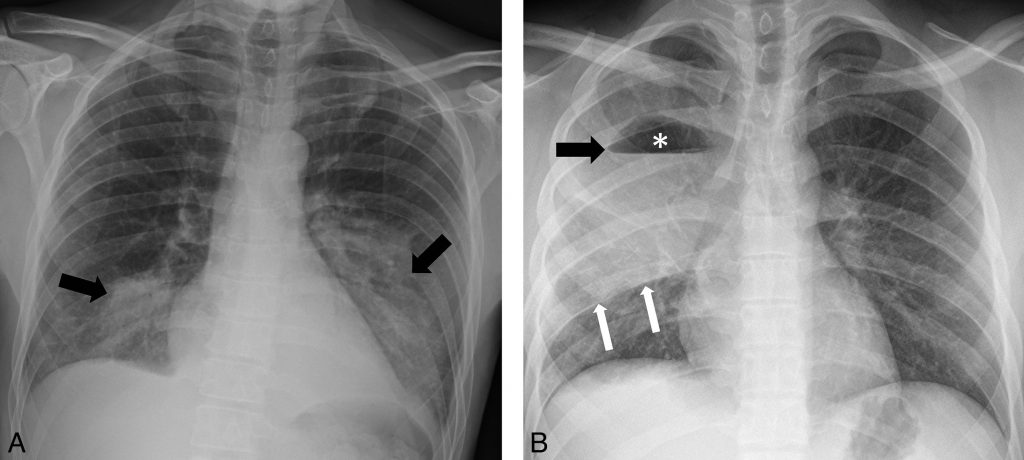 A Pneumonie bilatérale se traduisant par des foyers de condensations alvéolaires du lobe inférieur droit et du lobe inférieur gauche, n’effaçant pas la silhouette cardiaque (flèches). B Pneumonie lobaire supérieure droite se traduisant par un foyer de condensation alvéolaire du lobe supérieur droit avec appui scissural (flèches blanches), siège d’une excavation : clarté aérique supérieure (astérisque), niveau hydroaérique horizontal (flèche noire).