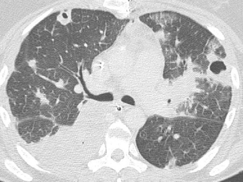 Contenu multimédia | Imagerie pulmonaire d’une pneumocystose | Pneumopathie bilatérale interstitielle diffuse à prédominance péri-hilaire | |
