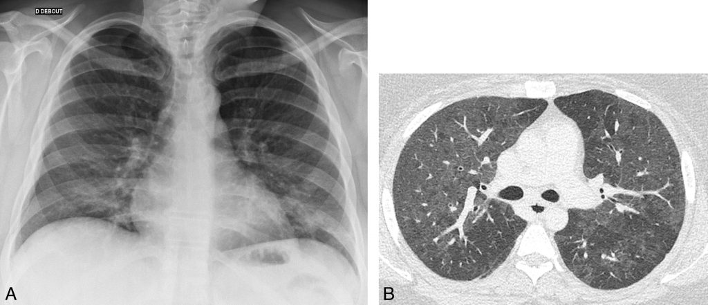 A. Radiographie de thorax réalisée chez une patiente porteuse d’une infection par le VIH présentant une dyspnée fébrile. Pas d’anomalie parenchymateuse. B. Scanner thoracique réalisé chez la même patiente qu’en A. Plages de « verre dépoli » bilatérales diffuses, peu denses, traduisant une pneumocystose pulmonaire.