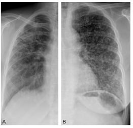 Images réticulaires de l’hémithorax droit (A, sarcoïdose) et nodulaires de l’hémithorax gauche (B, miliaire métastatique).