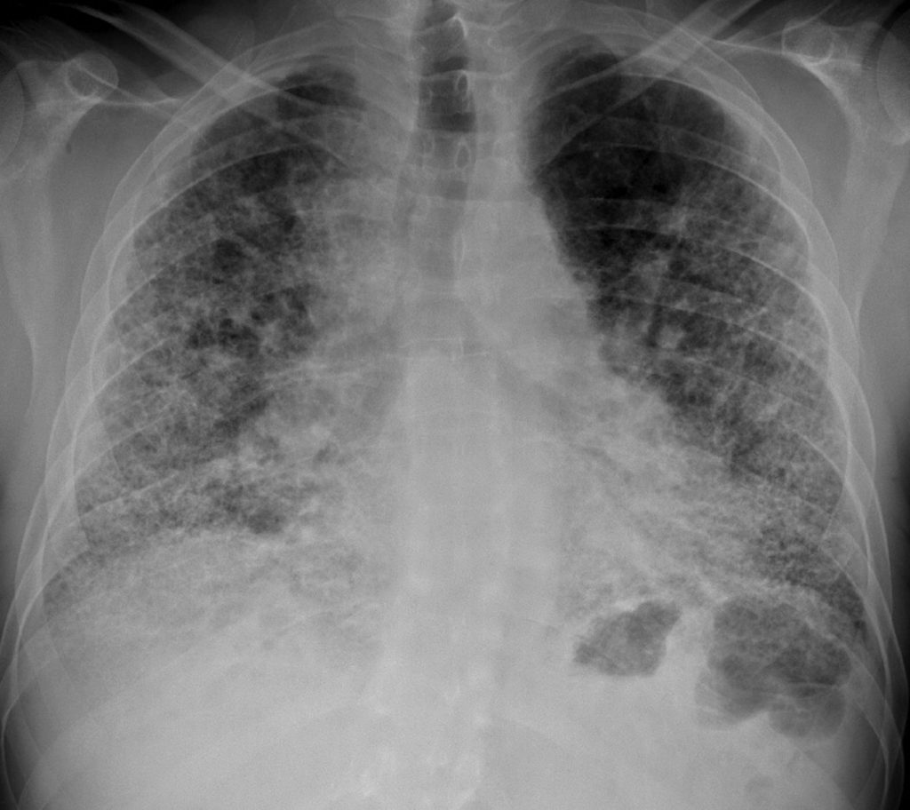 Opacités diffuses réticulo-nodulaires et diminution de volume des deux poumons.