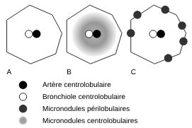 Le seuil de résolution du scanner ne permet d’identifier à l’état normal que l’artère centrolobulaire et non les parois du lobule et la bronchiole centrolobulaire. La présence de nodule centrolobulaire se traduit par des images le plus souvent floues au centre du lobule. Les nodules périlobulaires le long des septa interlobulaires témoignent d’une diffusion par les lymphatiques.
