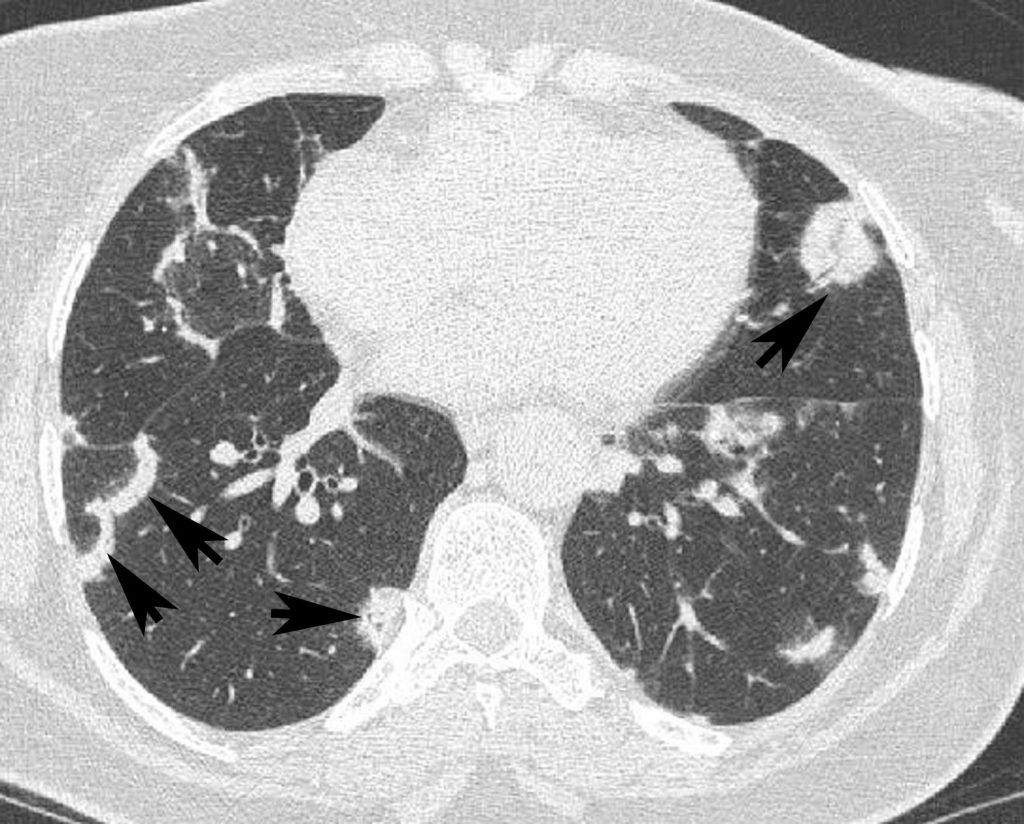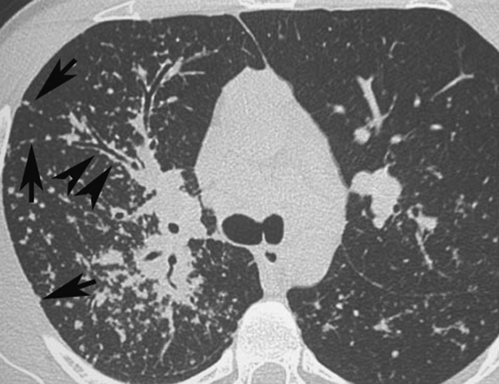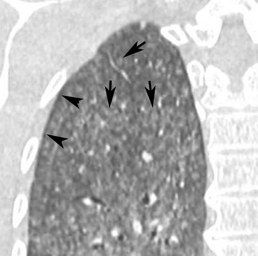 Agrandissement sur le sommet droit d’une coupe frontale. Micronodules à limites floues (flèches) de distribution diffuse dans les deux poumons. Leur topographie centrolobulaire est attestée par l’absence de micronodules sous-pleuraux (têtes de flèches).