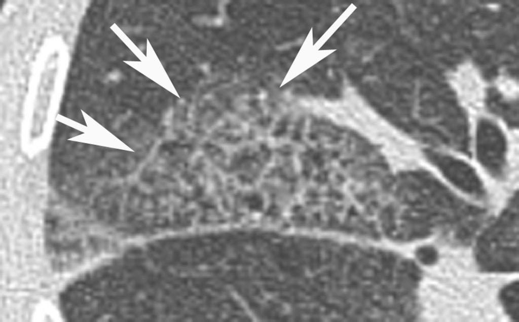 Réticulation intralobulaire. Présence de petites lignes irrégulières entrecroisées (flèches) séparant des îlots de parenchyme pulmonaire.
