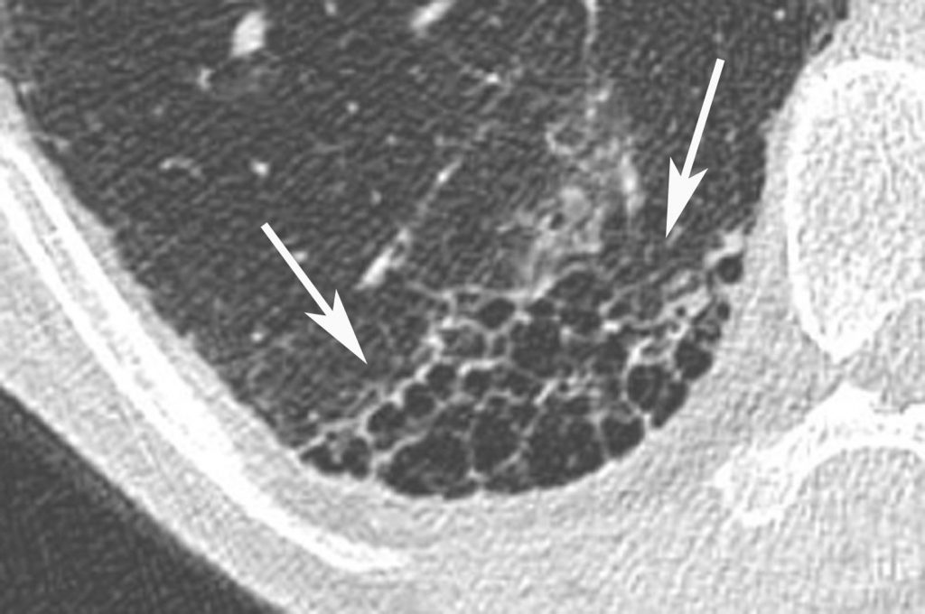Agrandissement sur la base droite. Poumon en « rayon de miel » dans la région sous-pleurale (flèches). Le contenu des kystes organisés en réseau est de densité aérique traduisant la destruction irréversible du parenchyme pulmonaire.