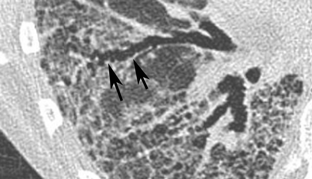 Agrandissement sur la base droite. Présence de dilatations bronchiques irrégulières (flèches) dans un poumon siège d’une réticulation intralobulaire. Elles traduisent la distorsion du parenchyme pulmonaire par une fibrose.