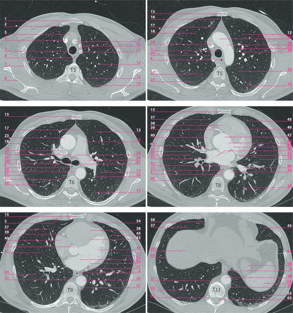 1. Manubrium sternal. 2. Pédicule thoracique (mammaire) interne droit. 3. Veine brachiocéphalique gauche. 4. Veine brachiocéphalique droite. 5. Partie thoracique de la trachée. 6. Partie thoracique de l’œsophage. 7. Arc costal moyen. 8. Scapula droite. 9. Tronc brachiocéphalique. 10. Artère carotide commune gauche. 11. Artère subclavière gauche. 12. Lobe supérieur du poumon gauche (culmen). 13. Grande scissure gauche. 14. Lobe inférieur du poumon gauche (segment apical — segment 6 dans la classification de Boyden). 15. Corps sternal. 16. Ligne médiastinale antérieure (affrontement du bord antérieur des poumons). 17. Loge thymique (médiastin antérieur). 18. Lobe supérieur du poumon droit. 19. Veine cave supérieure. 20. Crosse de la veine azygos. 21. Grande scissure droite. 22. Lobe inférieur du poumon droit (segment apical, 6). 23. Aorte ascendante (segment 1). 24. Arc aortique (segment 2). 25. Bronche distale du territoire de la bronche apicale du lobe supérieur gauche (normalement de diamètre inférieur à l’artère satellite). 26. Artère distale du territoire de l’artère apicale du lobe supérieur gauche. 27. Artère pulmonaire droite. 28. Bronche lobaire supérieure droite. 29. Bifurcation trachéale et carène. 30. Aorte thoracique descendante (segment 3). 31. Veine azygos. 32. Tronc pulmonaire. 33. Bronche principale droite. 34. Artère pulmonaire gauche. 35. Bronche principale gauche. 36. Artère du segment apical du lobe inférieur gauche. 37. Lobe moyen du poumon droit. 38. Ventricule droit. 39. Artère coronaire droite. 40. Atrium droit. 41. Veine pulmonaire supérieure droite. 42. Veine pulmonaire inférieure droite. 43. Veine pulmonaire inférieure gauche. 44. Lobe inférieur du poumon droit (pyramide basale). 45. Lobe supérieur du poumon gauche (lingula). 46. Artère interventriculaire antérieure et grande veine du cœur. 47. Sinus aortique (segment 0). 48. Valve aortique. 49. Ventricule gauche. 50. Atrium gauche. 51. Artère circonflexe. 52. Veine pulmonaire inférieure gauche. 53. Lobe inférieur du poumon gauche (pyramide basale). 54. Péricarde. 55. Septum interventriculaire. 56. Feuillet latéral de la valve mitrale (petite valve mitrale). 57. Veine hémi-azygos. 58. Angle cardiophrénique droit. 59. Dôme hépatique (segment VIII). 60. Coupole diaphragmatique droite. 61. Foramen intervertébral T11-T12 droit. 62. Coupole diaphragmatique gauche. 63. Estomac (fundus). 64. Rate. 65. Canal vertébral et moelle spinale.