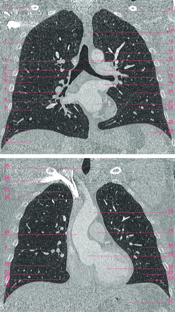 1. Clavicule droite. 2. Lobe supérieur du poumon droit. 3. Crosse de la veine azygos. 4. Carène. 5. Bronche principale droite. 6. Grande scissure. 7. Tronc de la pyramide basale droite. 8. Veine pulmonaire inférieure droite. 9. Lobe inférieur du poumon droit (pyramide basale). 10. Coupole diaphragmatique droite. 11. Dôme hépatique (segment VIII). 12. Apex pulmonaire gauche (au-dessus de la 1re côte). 13. Partie thoracique de l’œsophage. 14. Lobe supérieur du poumon gauche (culmen). 15. Arc aortique (segment 2). 16. Partie thoracique de la trachée. 17. Artère pulmonaire gauche. 18. Bronche principale gauche. 19. Veine pulmonaire supérieure gauche. 20. Grande scissure gauche. 21. Atrium gauche. 22. Lobe inférieur du poumon gauche (pyramide basale). 23. Coupole diaphragmatique gauche. 24. Rate. 25. Partie cervicale de la trachée. 26. Veine subclavière droite (opacifiée par le produit de contraste). 27. Veine brachiocéphalique droite. 28. Tronc brachiocéphalique. 29. Aorte ascendante (segment 1). 30. Petite scissure. 31. Lobe moyen du poumon droit. 32. Angle cardiophrénique droit. 33. Tronc pulmonaire. 34. Lobe supérieur du poumon gauche (lingula). 35. Sinus aortique (segment 0). 36. Ventricule gauche. 37. Estomac (fundus).