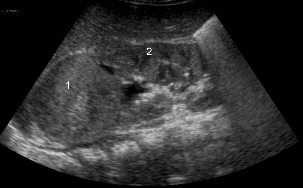 L’échographie met en évidence une masse (1) développée aux dépens du pôle supérieur du rein (2). Cette masse est d’échostructure tissulaire. L’âge de l’enfant, la localisation rénale et le caractère tissulaire suggèrent fortement le diagnostic de néphroblastome.