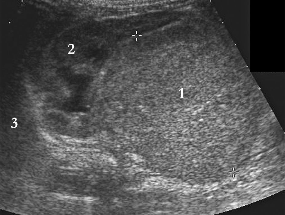La masse (1) est homogène, d’échostructure tissulaire, et refoule le rein droit normal (2). Un liséré hyperéchogène sépare les deux. Le foie (3) est refoulé vers le haut.
