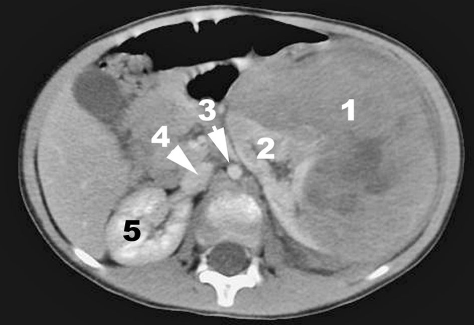 La tumeur, partiellement nécrosée (1), est enchâssée dans le rein gauche (2). Autres structures : aorte (3), veine cave inférieure (4), rein droit (5).