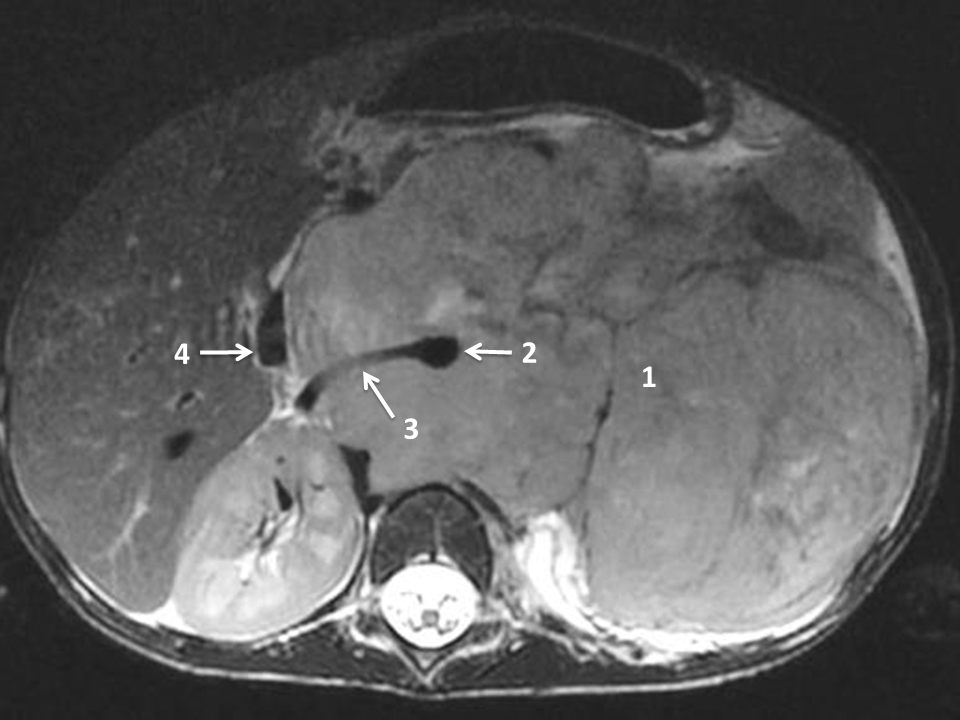 La tumeur (1) infiltre le rétropéritoine médian en englobant l’aorte (2), l’artère rénale droite (3) ; la veine cave inférieure est refoulée à droite (4).