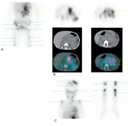 La volumineuse masse tumorale abdominale fixe la 123I-MIBG. Les images planaires mettent en évidence plusieurs hyperfixations du squelette en faveur de localisations secondaires. A. Image planaire, vue antérieure centrée sur l’abdomen, le bassin et les cuisses. B. images axiales tomoscintigraphiques couplées TDM centrées sur l’abdomen (flèches jaunes). C. Images planaires vue antérieure centrées sur le crâne et le thorax et sur les jambes, (flèches bleues).
