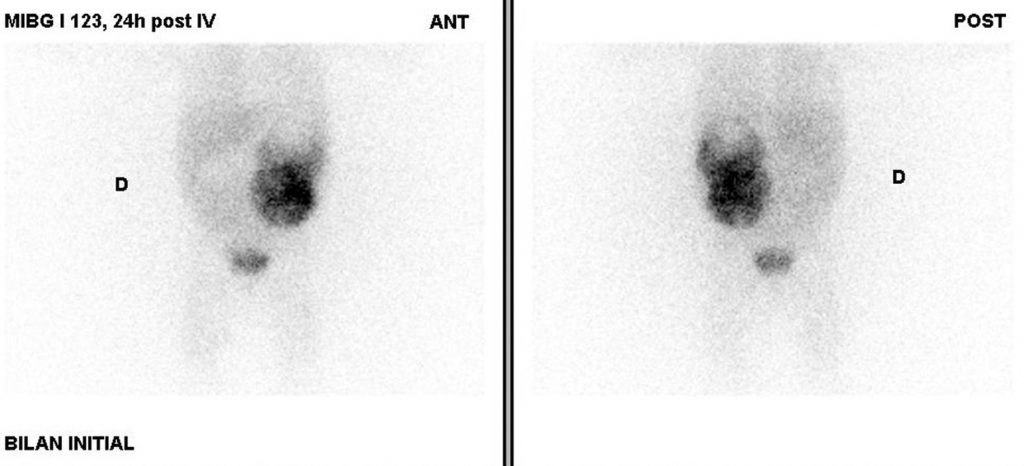 Le tissu tumoral fixe la 123I-MIBG, sauf dans sa partie supérieure qui est nécrosée. La vessie est visible du fait de l’élimination urinaire du traceur. Il n’y a pas de localisation secondaire, notamment sur le squelette.