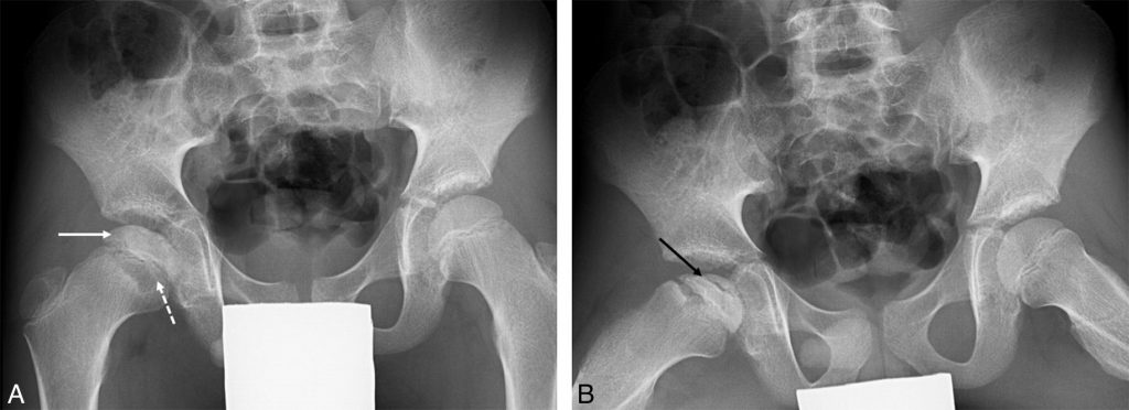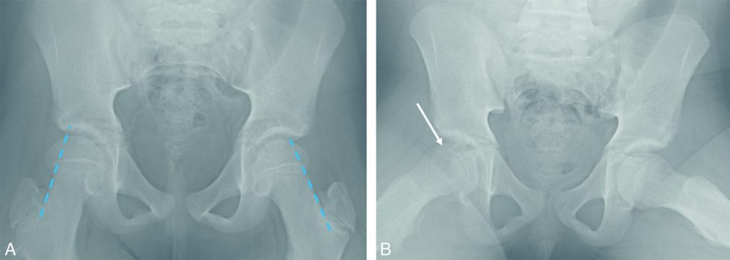 La radiographie de bassin de face (A) est normale : la ligne de Klein (trait en pointillé), tangente à la corticale supérieure du col fémoral, coupe de façon symétrique les épiphyses fémorales proximales. Sur le cliché de profil (B, incidence de Lauenstein), l’épiphyse fémorale proximale droite a basculé en bas et en arrière avec un décroché antérieur entre l’épiphyse et la métaphyse (flèche). Ce cas illustre l’importance de réaliser un cliché de profil additionnel pour le bilan d’une boiterie car le cliché de face peut être normal.
