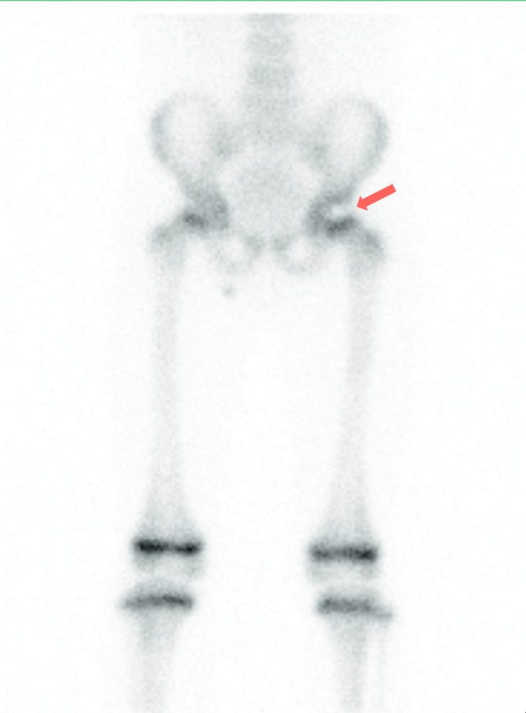 Fig. 114.3 Scintigraphie osseuse en face antérieure montrant une hypofixation du noyau épiphysaire de la tête fémorale gauche (flèche rouge) en lien avec une ostéochondrite.